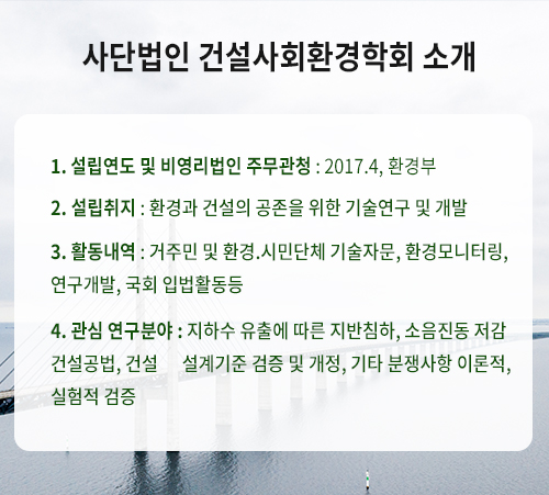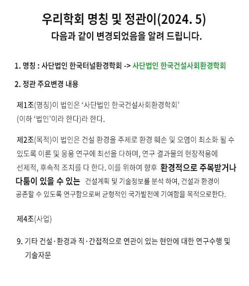 우리학회 홈페이지 방문을 환영합니다. 우리학회는 건설.환경을 주제로 환경훼손 및 오염이 최소화 될 수 있도록 이론 및 응용 연구에 최선을 다하며, 연구 결과물의 현장적용에 선제적, 후속적 조치를 다 하고 있습니다. 이를 위히여 향후 건설 계획 및 기술 정보를 분석하여, 건설과 환경이 공존할 수 있도록 연구함으로써 균형적인 국가발전에 기여함을 목적으로 설립되었습니다